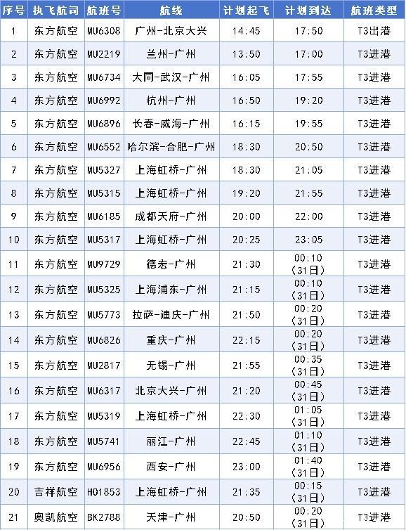 特别注意:10月30日当天除上述21架指定航班外,上述航司的其他进出港航班仍在白云机场T1航站楼运营。(具体以航司通知为准)